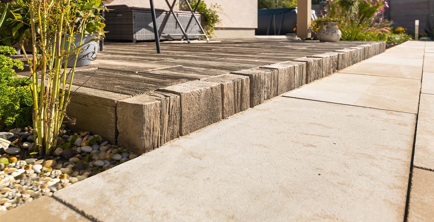 PALISÁDOVÝ OBRUBNÍK umožňuje definovat různé plochy v terénu, lemovat a uzavírat plochy vydlážděné pomocí dlažby PRKNO – VZOR DUB. Ve funkci nízké praktické trojpalisády řeší boční pohledové stěny mírně vyvýšených teras a schodišťových stupňů. Je velmi praktickým doplňkem v zahradě nebo u domu, kde jsou použity další prvky z programu IMITACE DŘEVA. Do detailu vypracovaný nepravidelný povrch hrubější struktury dubového dřeva je k dispozici ve třech odstínech.