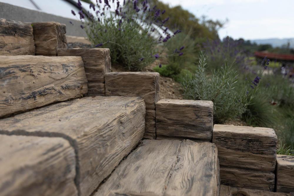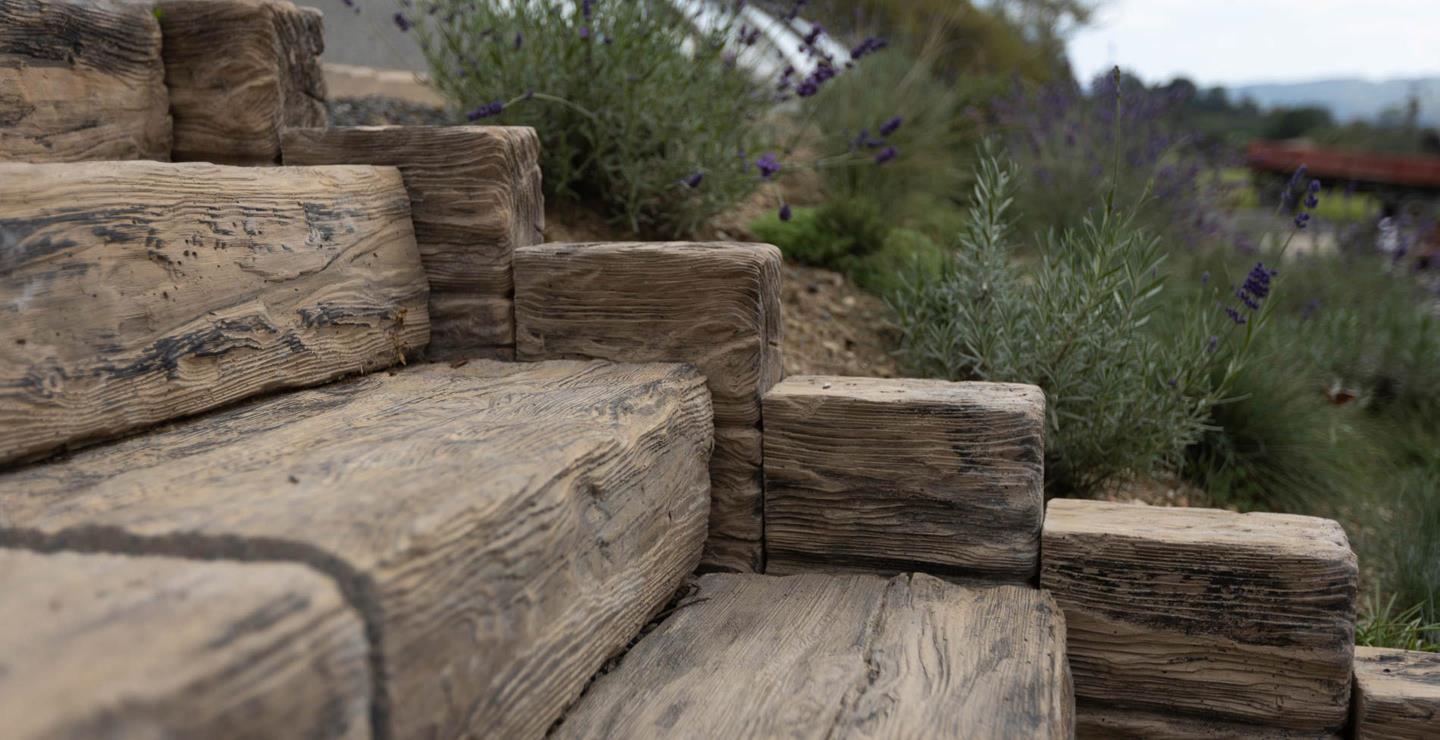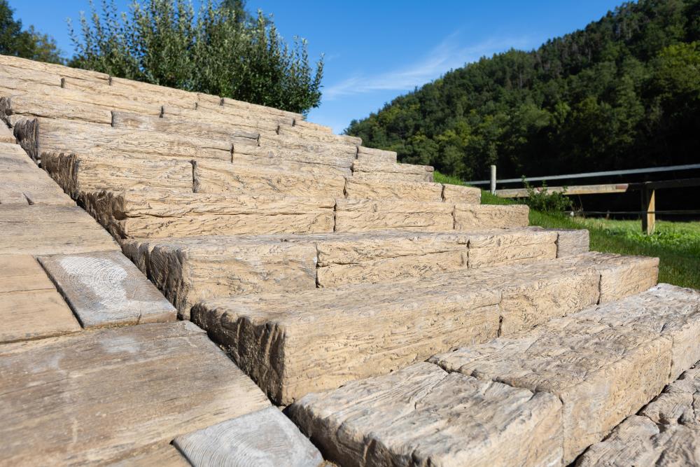 V programu IMITACE DŘEVA nabízíme prvky pro konstrukce schodišť v terénu i u domu v provedení NATUR PATINA, který charakterizuje hrubější povrch dřeva v rustikálním stylu. SCHODIŠŤOVÝ BLOK / PALISÁDA o rozměru 60 × 25 × 16 cm v poloze naležato slouží pro budování schodišť lemovaných palisádou.