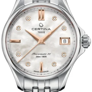 Dámské hodinky Certina DS Action Lady Powermatic 80 spojují sportovní odolnost s noblesní krásou – safírové sklíčko, ocelové tělo a perleťový ciferník s diamanty vytvářejí šperk, který nezastaví čas ani voda do hloubky 200 metrů.